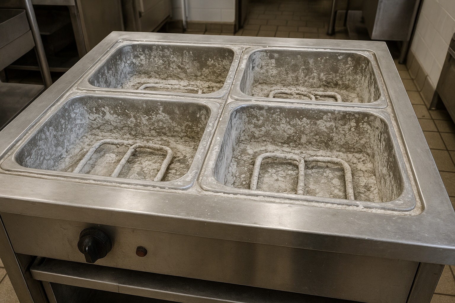 A commercial stainless steel steam table in a professional kitchen with four food wells coated in heavy white mineral buildup and limescale.