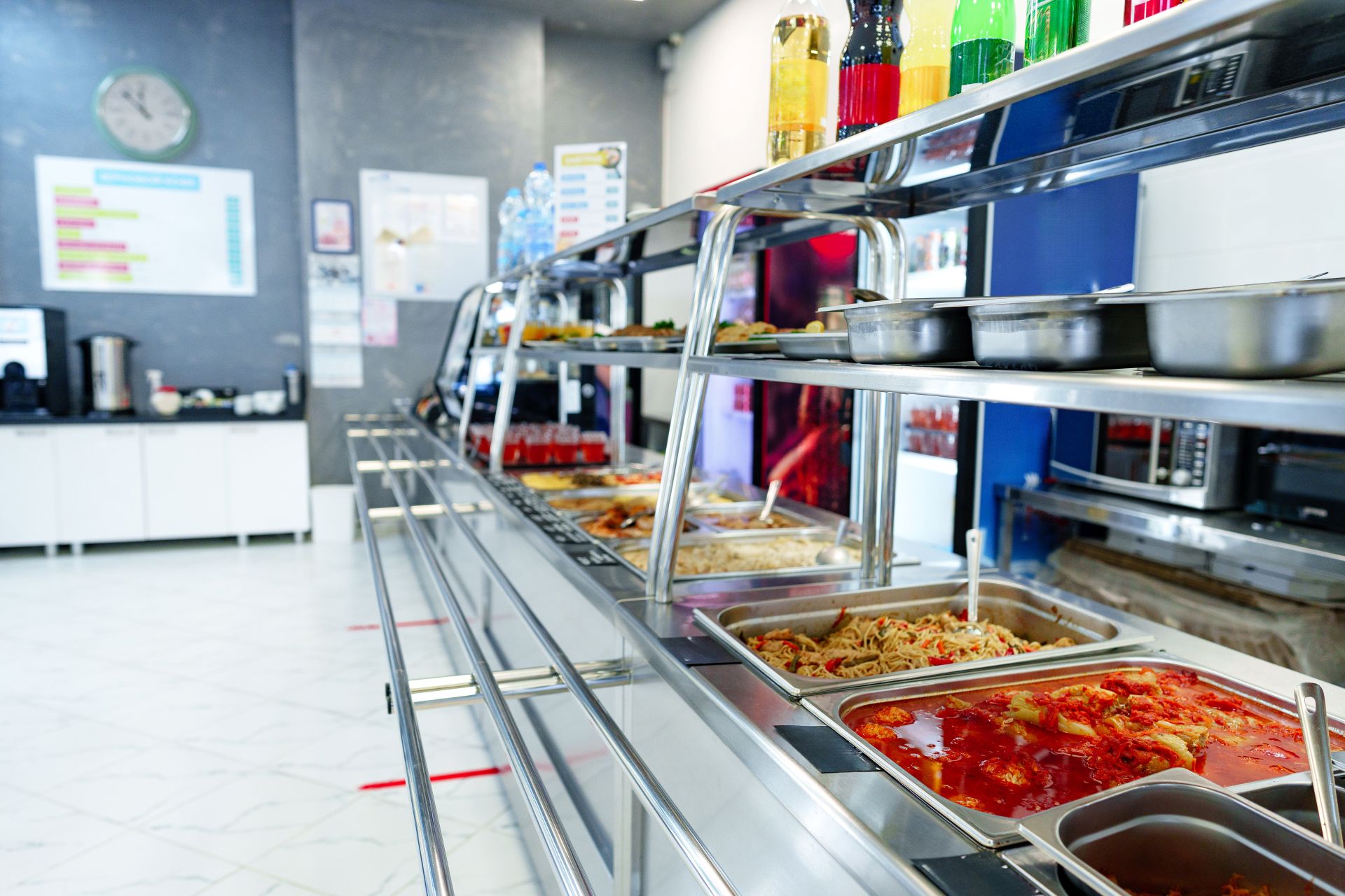 Bustling Cafeteria Serving Line During Lunchtime Offering a Variety of Dishes